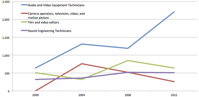 Occupational data looked a bit more promising, but while the four major film & television occupations showed growth overall, only the largest and least production-specific group — Audio & Video Equipment Technicians — showed actual growth. (see the following chart).
